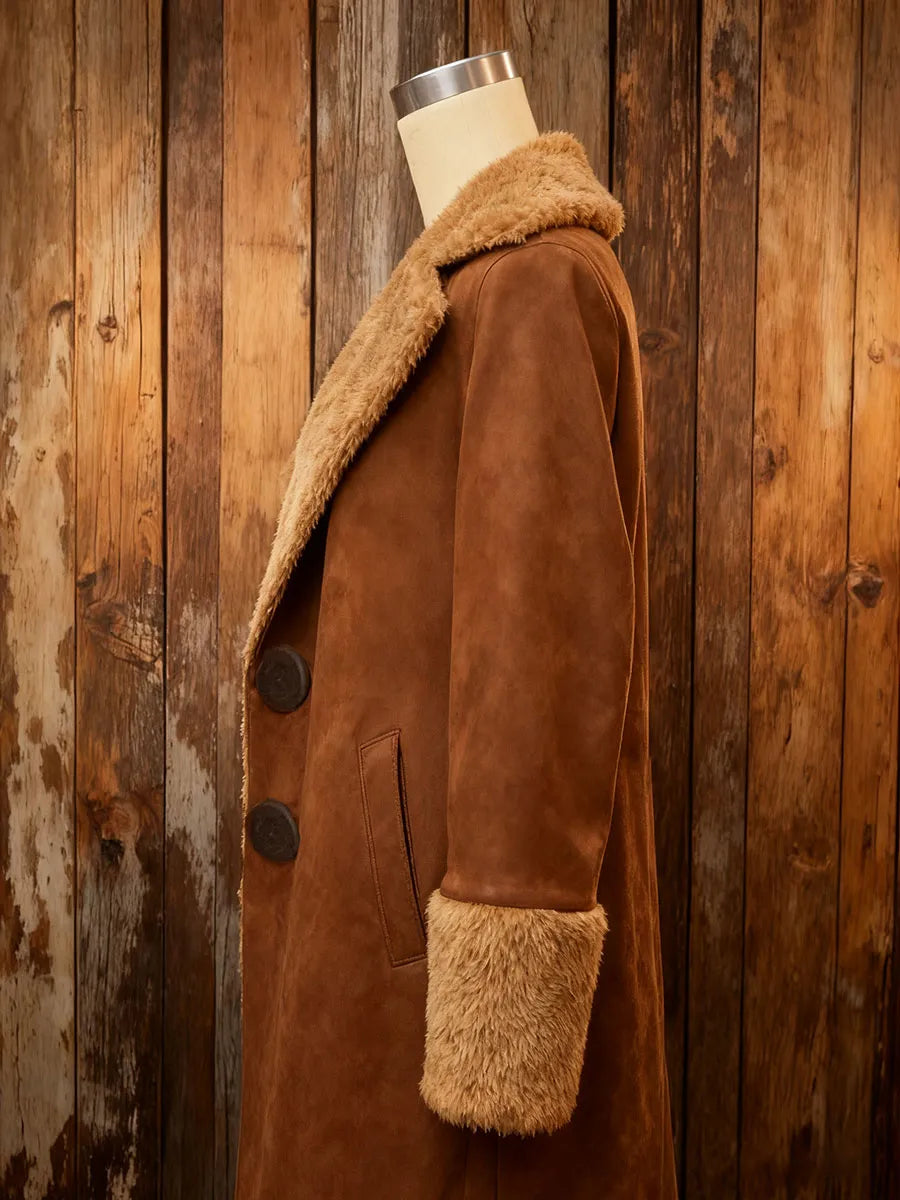This long faux-suede coat with a plush faux-fur lining is an ode to vintage elegance and untamed warmth. Its soft suede-like exterior paired with a cosy inner lining creates the perfect balance between sophistication and comfort. The gently flared long silhouette elongates the figure, while the textured contrasts add a sense of freedom and refined femininity. A standout piece that transforms every outing into a graceful moment.